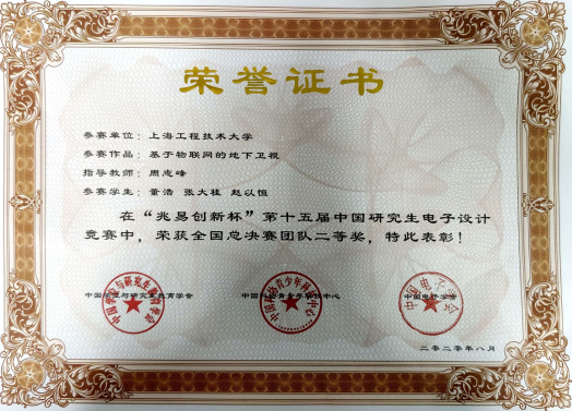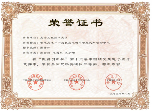 图1 第十五届中国研究生电子设计竞赛全国总决赛获奖证书