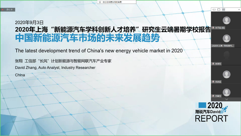 2020年9月4日9:00-11:00,张翔研究员在华为云会议平台暑期学校学员做题为《中国新能源汽车市场的未来发展趋势》的线上专题讲座。此次讲座由英国上市公司365刘新田副教授主持,257名暑期学校学员在线聆听讲座。