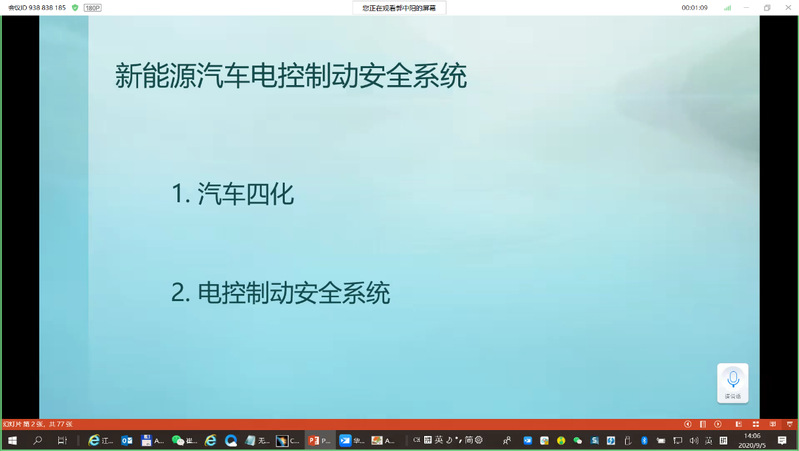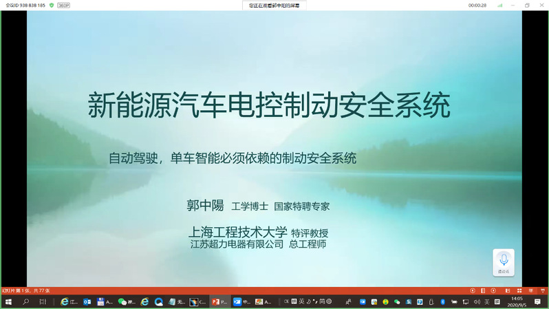 2020年9月5日14:00-16:00,国家特聘专家郭中阳教授在华为云会议平台暑期学校学员做题为《新能源汽车电控制动安全系统》的线上专题讲座。此次讲座由英国上市公司365崔国华教授主持,257名暑期学校学员在线聆听讲座。