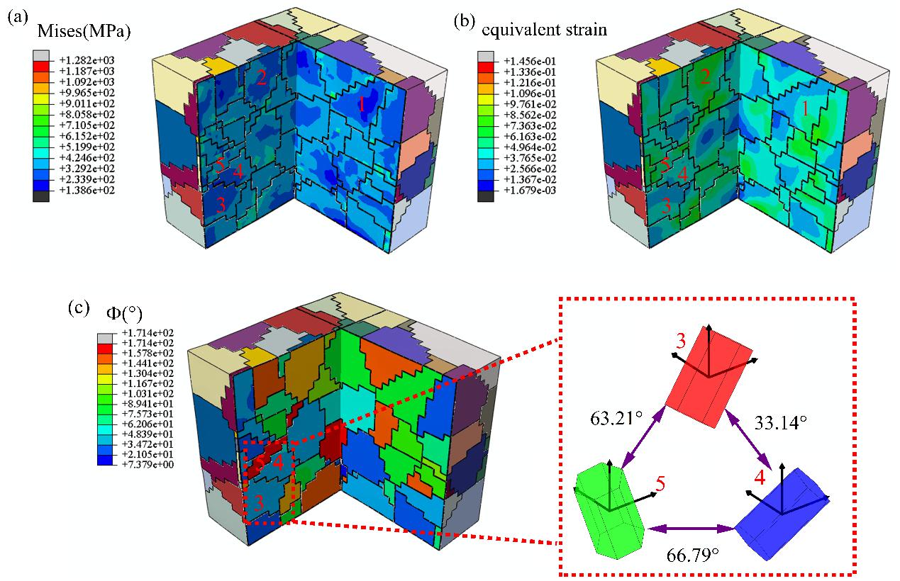 针对密排六方晶格(HCP)晶体结构的工业纯钛在室温下具有高度的各向异性性质,论文解决在介观尺度上的晶体取向呈现的轧制织构所导致的技术难题。在室温下对五种不同角度的光滑试件进行拉伸实验并通过EBSD和SEM分别对中心变形区域和断裂区域进行表征;将修正的各向异性硬化模型以增量硬化形式纳入晶体塑性有限元(CPFEM)框架,来描述纯钛的各变形系统的初始强度和硬化增量演化;在CPFEM模拟中考虑了滑移和孪生两种机制,使用三种不同划分网格策略的模型在第一象限均分的五个方向进行了准静态拉伸条件模拟以捕捉纯钛板材宏微观变量演化。研究结果表明:应力应变,系统活性,累积剪切应变,晶体取向,孪生体积分数,应力三轴度和Lode参数等变量均存在各向异性。