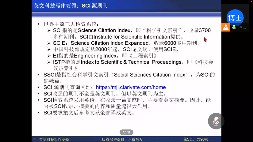 讲座中辛教授详细的为大家介绍了何为SCI源期刊以及期刊分区的依据,并推荐了分区以及影响因子查询神器“中国科学院文献情报中心“(微信小程序)来帮助大家快速了解各个期刊具体状况。接着教授讲到ESI这一概念,ESI是目前普遍使用于衡量学科研究绩效、跟踪学科发展趋势的分析评价工具,并借此鼓励同学发表高水平SCI论文。讲到EI源期刊板块时,辛教授强调英文摘要的质量好坏对是否录用起到很大作用并为我们推荐了众多选刊工具如Google Scholar、LetPub、小木虫、丁香园等。