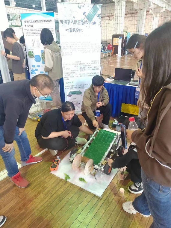 在比赛过程中,各参赛队伍通过实物展示和现场问辩的方式,充分展示了作品特点和创新思维。同学们综合运用所学“机械原理”、“机械设计”等课程的设计原理与方法,设计制造出了多款高性能的兴农机械和仿生机械作品,展示了在机械创新领域的深厚实力。评委们从作品的创新性、实用性、技术含量等多个方面进行了严格评分,评选出了一批优秀的作品和团队。我校参赛学生凭借其出色的作品表现,赢得了评委和观众的一致好评。