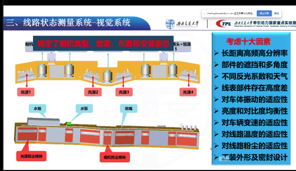 丁建明教授首先阐述了轨道与车辆智能运维的总体架构,从轮轨系统的智能运维出发,以线路和车轮状态测量系统为切入点,介绍了轨道运维策略技术。在讲解线路状态测量系统时,丁教授的团队着力于智能巡检系统的研发,团队解决了从相机、光源的类型与数量,到设备的布置和安装姿态等多个技术难题。同时,他们的团队确定了相机的触发方式、恒温控制方式、清洗模式及工装的外形和密封性能。这些研究成果大大提高了设备的稳定性和检测精度以取代传统的巡道工作,大幅提升了生产效率,视景检测系统也能够自动检测轨道病害图像,处理相关信息,并建立轨道信息化档案。