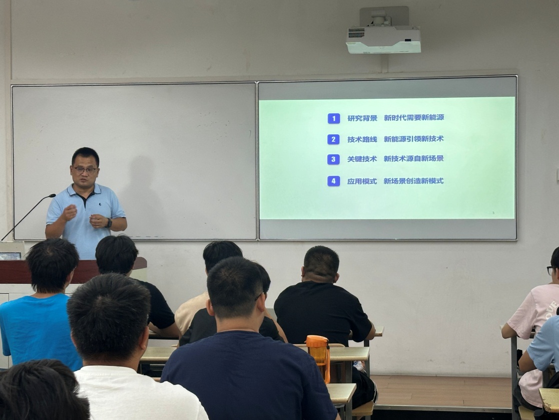张亮修总经理结合丰富的工作经历,围绕新能源汽车研究背景、技术路线、关键技术和应用模式四个方面开展了启发式教学。首先,张经理通过介绍汽车发展历程及发展过程中出现的能源及污染问题,引出“新时代需要新能源”;其次,通过分析过去十年的技术发展,分析了纯电动汽车、混合动力汽车、氢燃料电池汽车和在线直流驱动运输系统的技术发展路线与趋势,提出“新能源引领新技术”;然后介绍汽车发展的新场景,提出“新技术源自新场景”;最后,结合新能源汽车发展的新模式,提出“新场景创造新模式”,并以“仰望星空、脚踏实地、埋头苦干、合作共赢”结束授课,激发同学。
