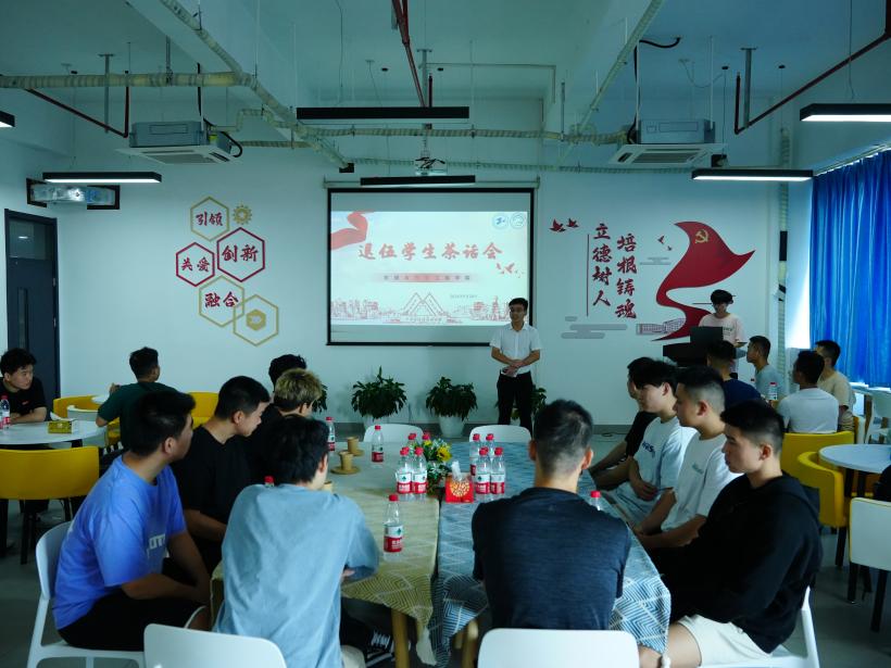 本次活动特别举办退伍学生茶话会,学院负责国防教育与征兵工作辅导员谢祥雄老师和全体退伍学生深入交流,详细了解他们在校的学习、生活状态及未来规划,鼓励他们要继续发扬军人的优良传统,发挥榜样、标兵作用,不断加强理论学习,全面提升自身综合素质。