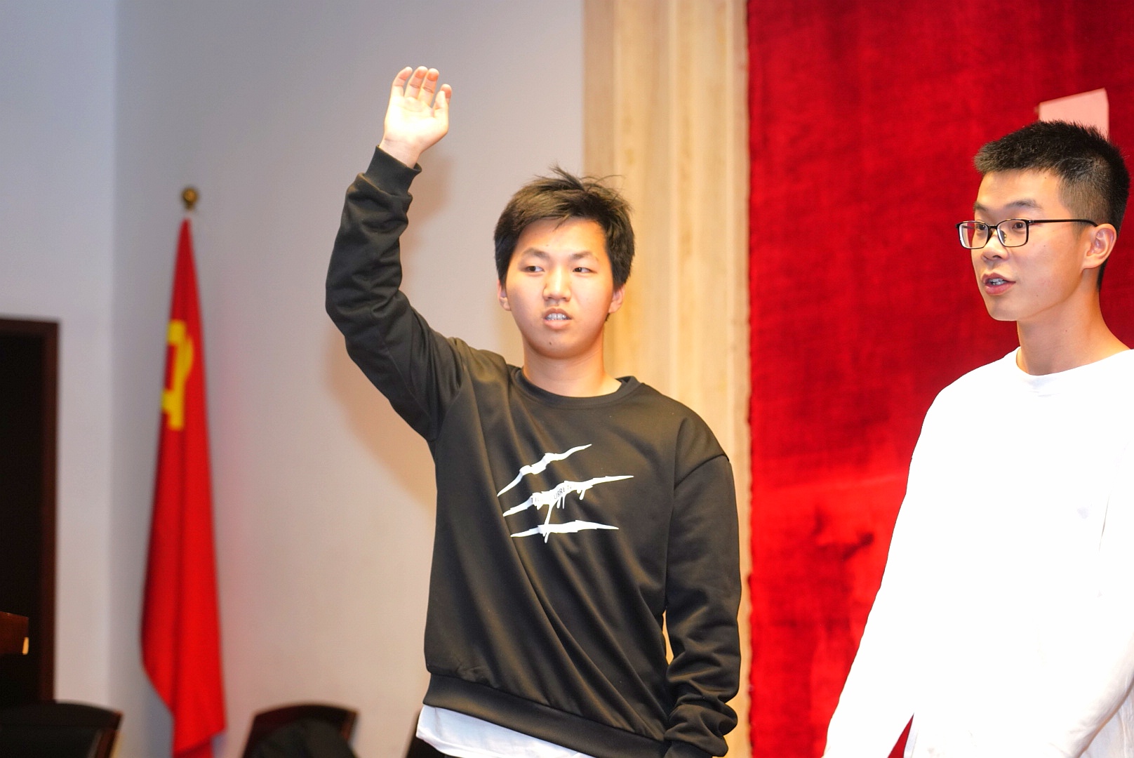 “我爱你中国亲爱的母亲,我为你流泪也为你自豪……”“没有共产党就没有新中国,没有共产党就没有新中国……”
