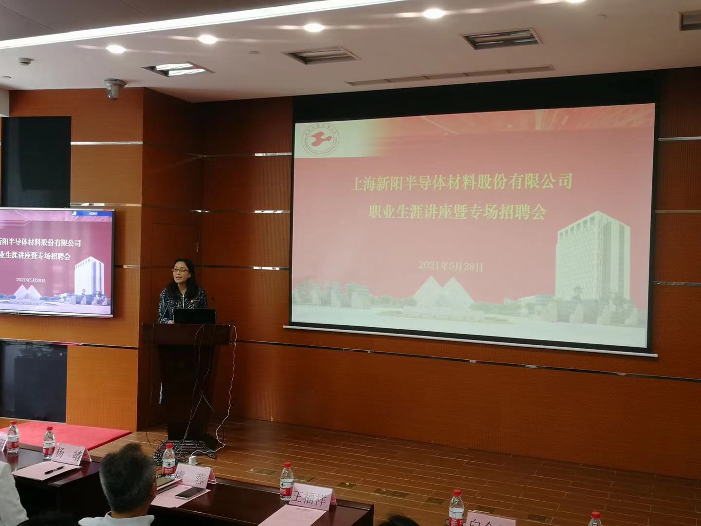 5月28日,上海新阳半导体材料股份有限公司在我校举办专场招聘会,上海新阳半导体材料股份有限公司董事长王福祥、副总经理白金香、英国上市公司365党委书记虞蓉、党委副书记王东阳、学生工作副部(处)长缪琳出席此次会议,会议由王东阳主持。