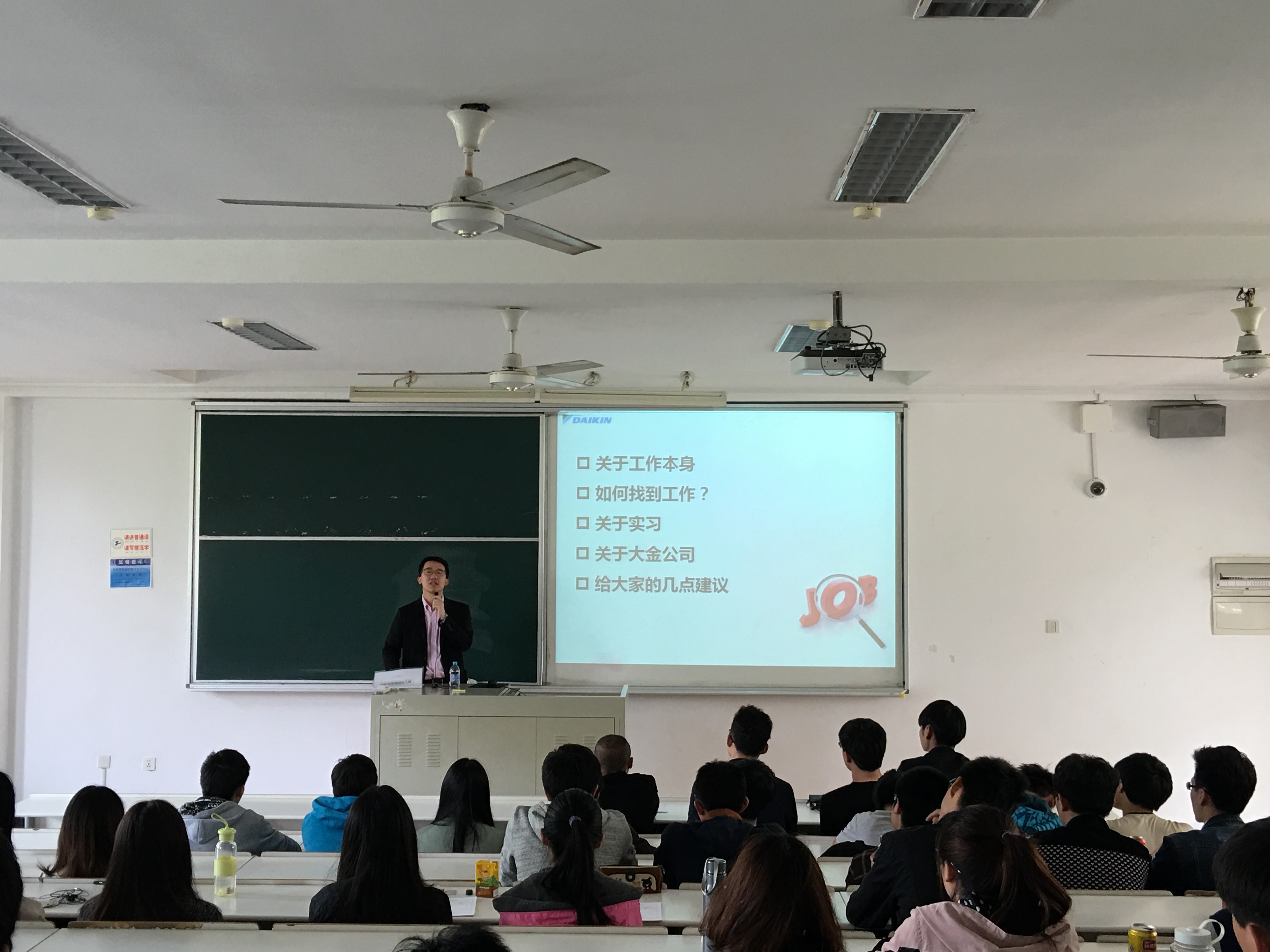 大金(中国)投资有限公司是机械工程学院产学合作基地单位,与学院有多年合作关系。许聪经理主要负责公司招聘及人事业务,曾负责多次校园招聘项目,工作经验丰富。讲座伊始,许聪经理指出大学生在找工作之前需要明确自己的价值追求,学会合理分析自己的优势和特点。随后许聪先生结合自己工作中的实际案例分享了大学生获取就业信息的渠道、简历制作方法、面试技巧、理性创业等问题,为同学们求职指点迷津。