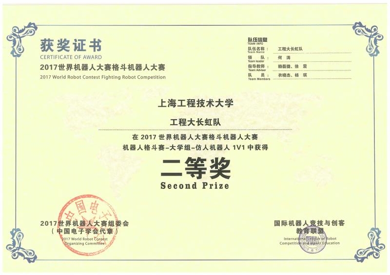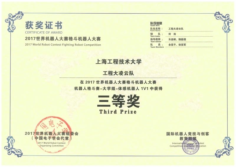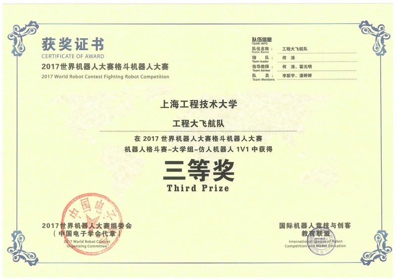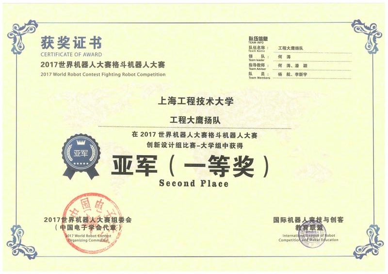 8月23日至8月27日,世界机器人大会在北京举行,中共中央政治局委员、国务院副总理刘延东出席世界机器人大会开幕式并讲话。作为大会三大板块之一,机器人大赛被誉为机器人界的“奥运会”。 我校首次派出了由机械工程学院学生组成代表队,在指导教师何涛、潘颖、赖磊捷、杜向阳、朱姿娜、徐震等带领下参加该项大赛。经过激烈的角逐,我校获得了一等奖1项、二等奖1项、三等奖3项、“优秀指导教师”1项的优异成绩。