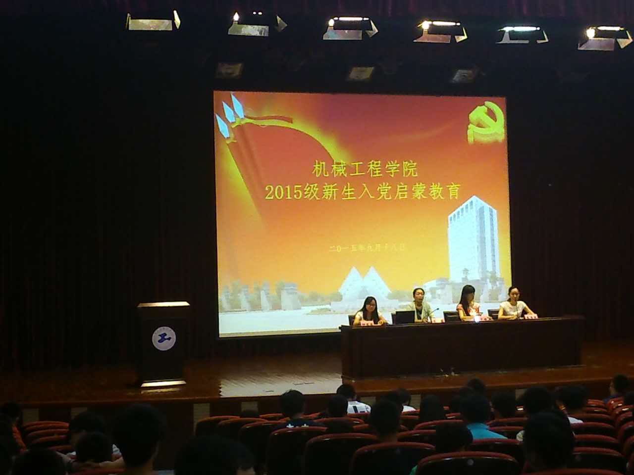 20150918日下午,英国365集团公司机械工程学院党委在志宏堂召开2015级新生入党启蒙教育大会,学院党委书记虞蓉、副书记梅元媛、学生科创党支部柳苗苗以及组织员李雪苗出席会议。