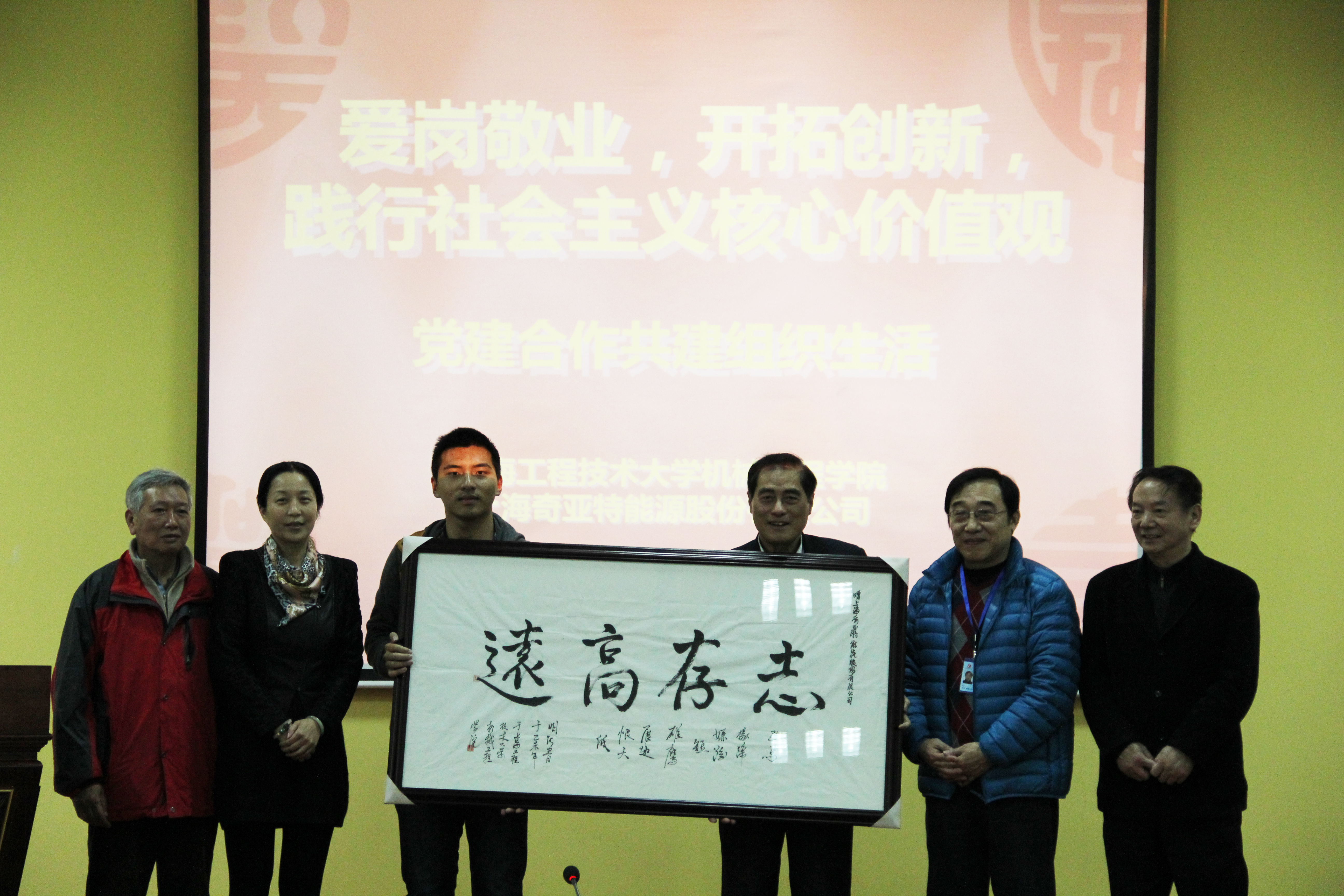 组织生活伊始,学院关工委委员、校外特聘辅导员张海成同志作关于“爱岗敬业,开拓创新,践行核心价值观”的专题报告。在报告中,张海成老师分享了自己的亲身经历和学习心得体会,使在座的每一个人受益匪浅,张老师用丰富的人生阅历诠释了如何用自己的实际行动践行社会主义核心价值观。接下来,进行校企双方导师受聘仪式,公司董事长秘书周政伟宣读了企业导师与学生党员结对名单,学院科创党支部学生党员代表向公司党总支赠送了精心准备的“志存高远”学生书法作品。随后,学生党员代表学院大学生科创工作室学生负责人刘洋同学进行发言,他结合自己参加科创比赛和社会实践的经历,分享了对践行社会主义核心价值观的认识。