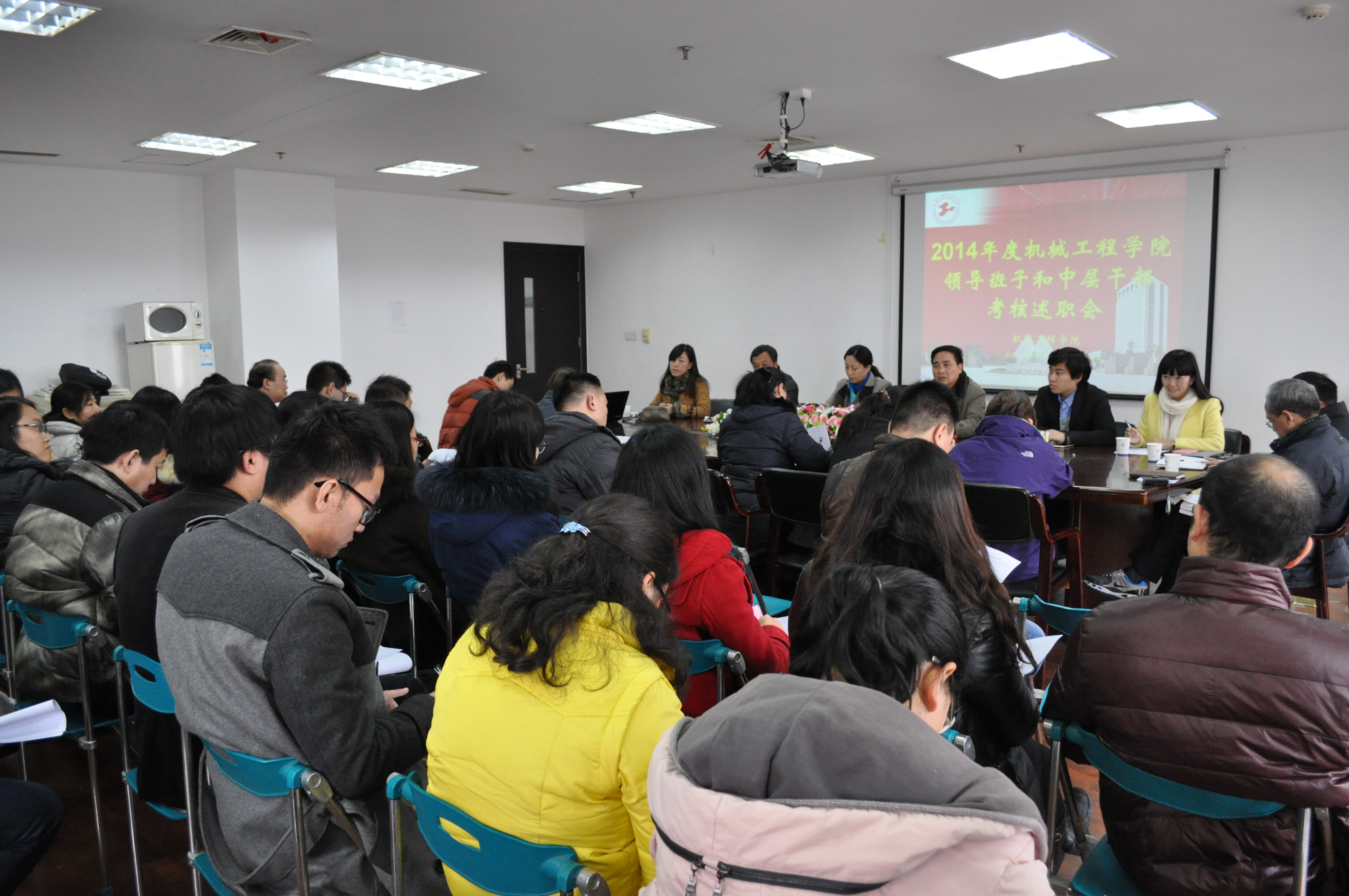 2014年12月26日下午,机械工程学院在行政楼1208室召开2014年度领导班子和中层干部考核述职会,教师代表、各党支部书记、群众代表参加了此次会议,会议由虞蓉书记主持。