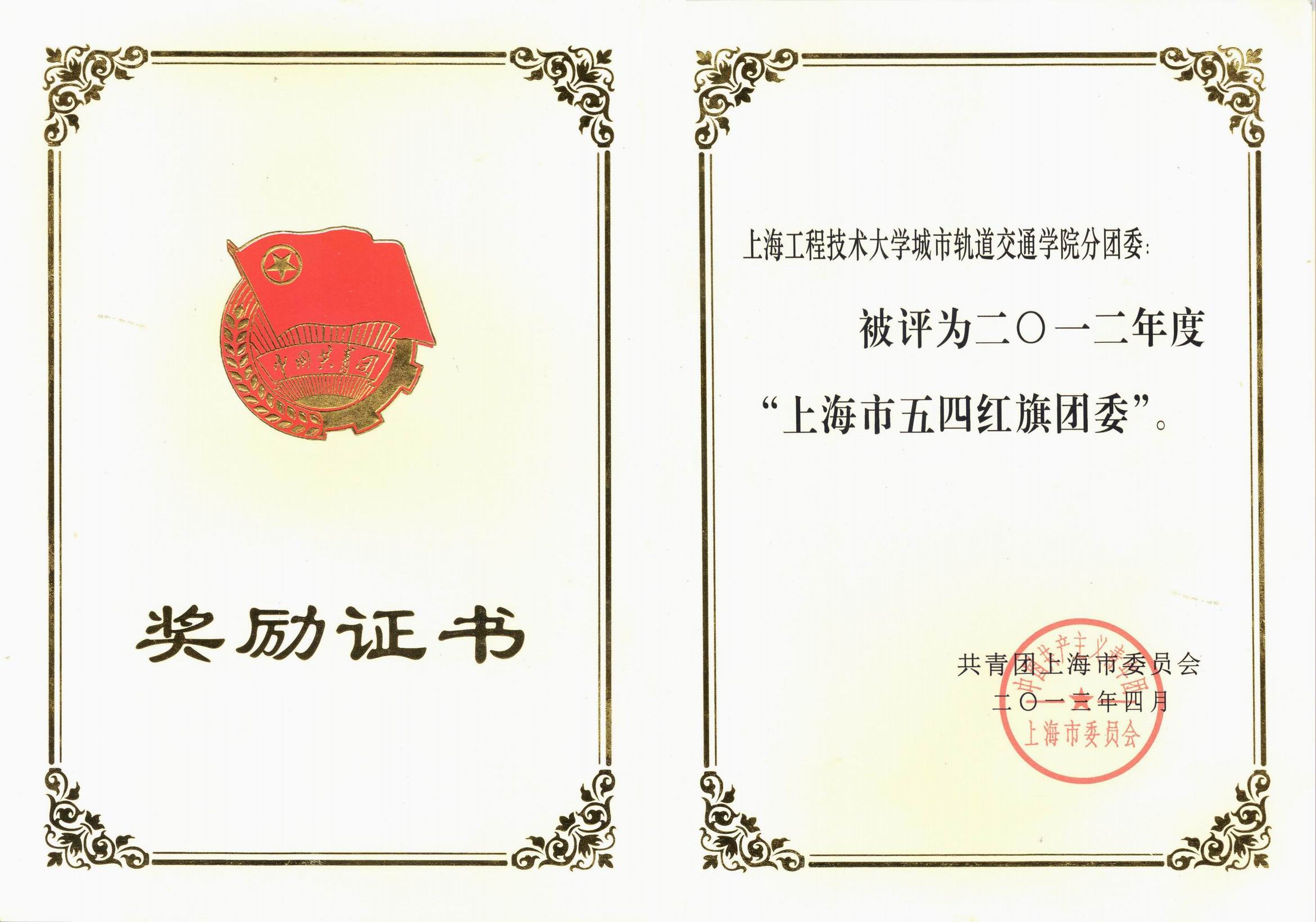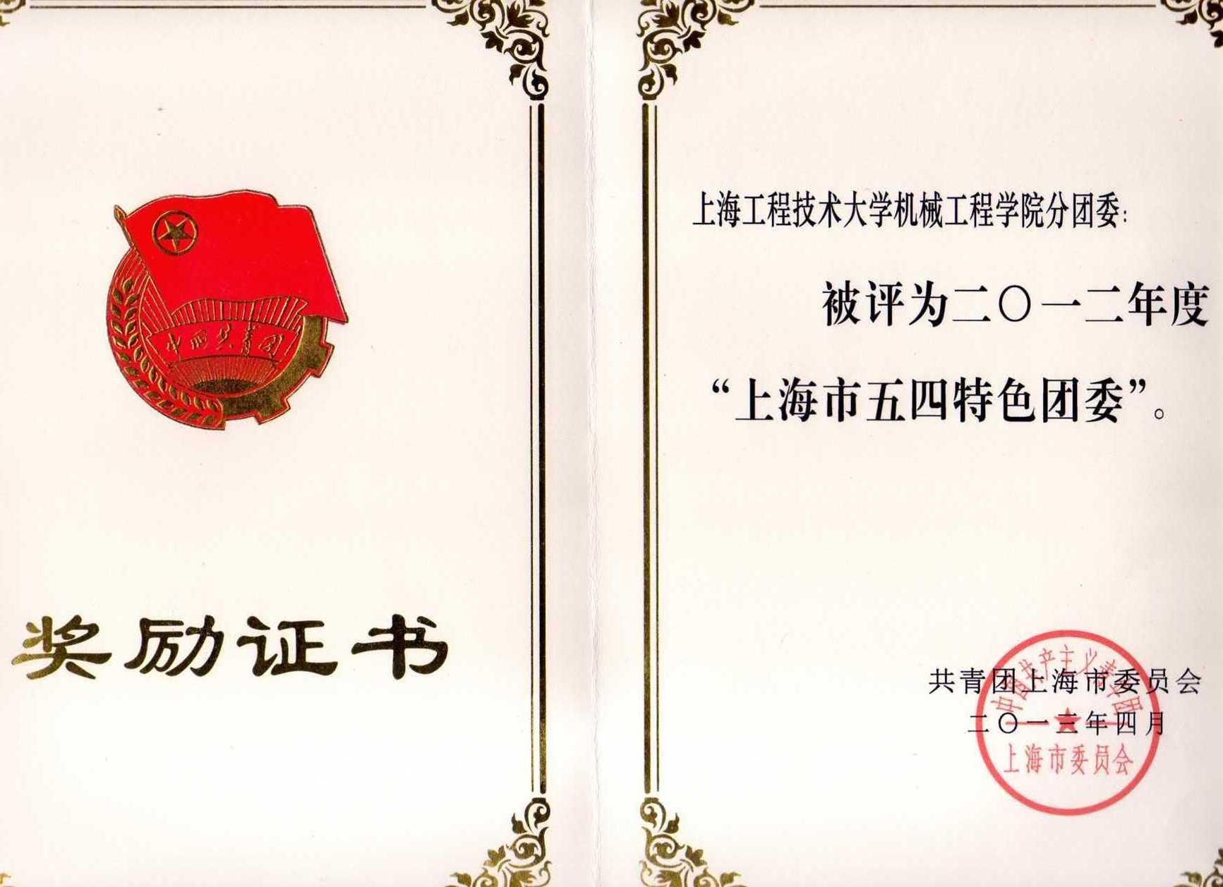 在过去的一年里,团委在学校党委的正确领导下,在各学院、部、处、室的大力支持下,引领我校团员青年成长成才,着力加强基层团建,涌现出一批先进典型人物和集体。近日,在2012年团市委开展的“争红旗创特色”活动中,城市轨道交通学院分团委荣获2012年度“上海市五四红旗团委”称号、机械工程学院分团委荣获2012年度“上海市五四特色团委”称号、化学化工学院0414102班团支部荣获2012年度“上海市五四红旗团支部”称号。