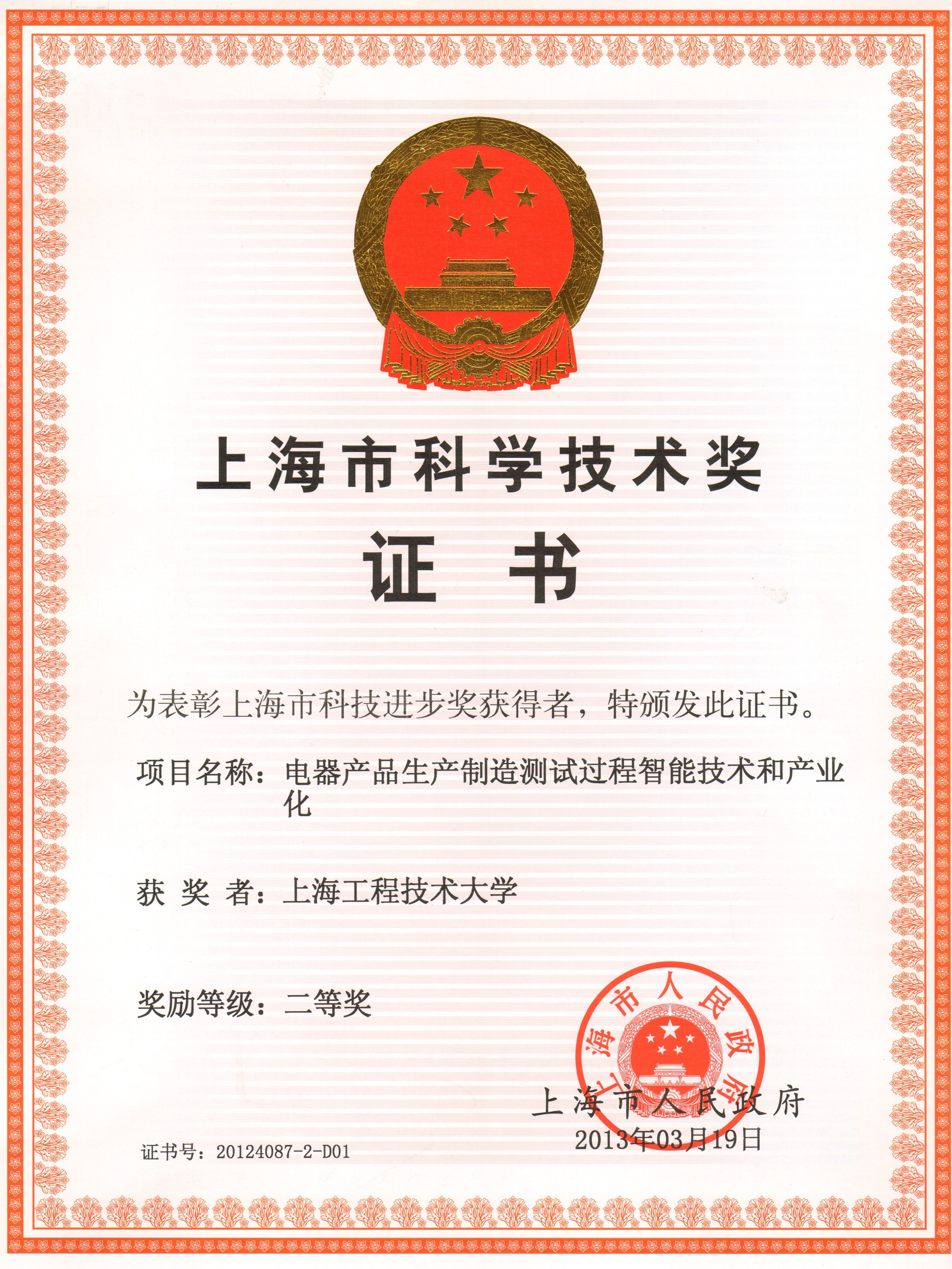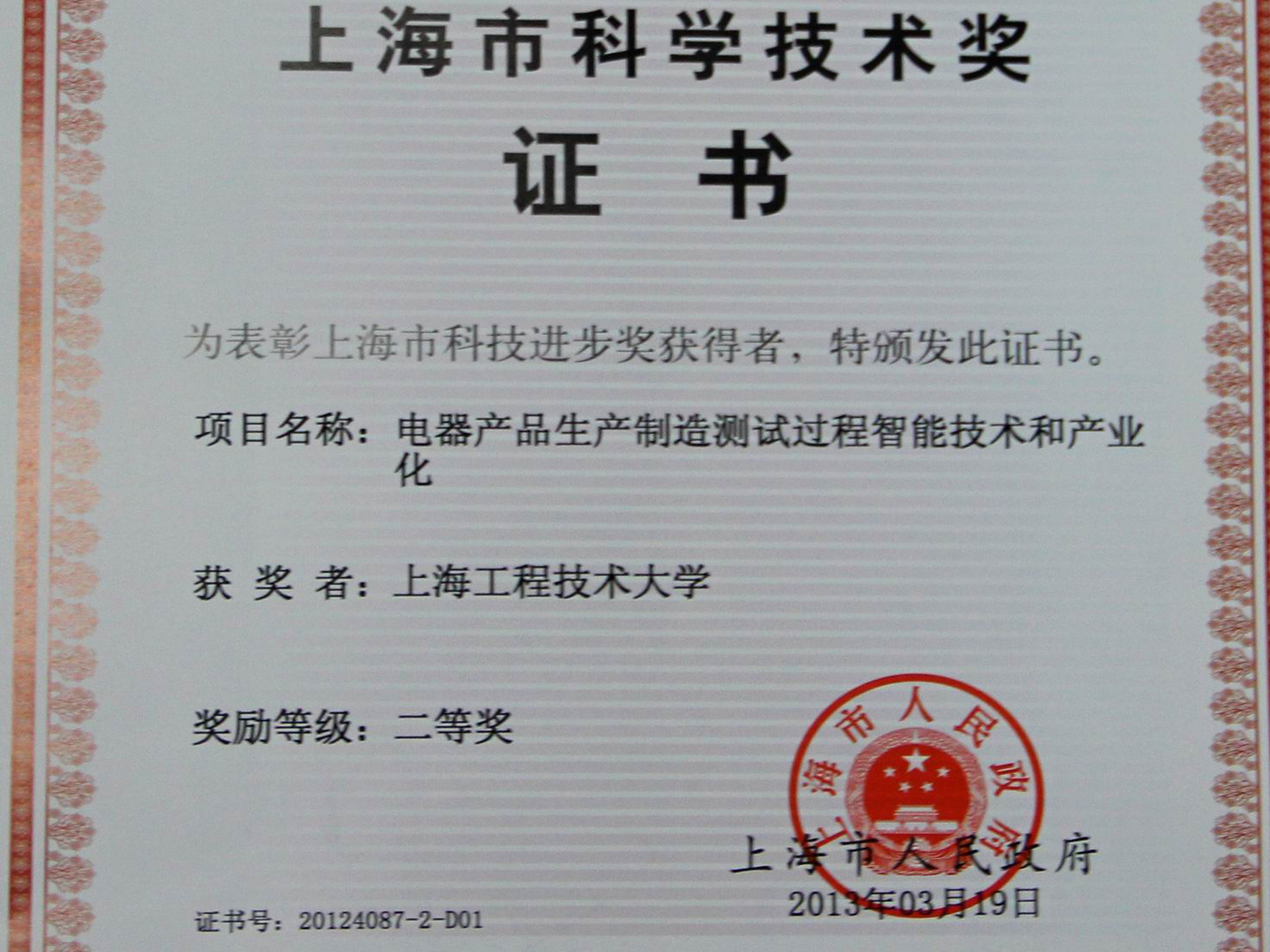 近日, 我校“电器产品生产测试制造过程智能技术和产业化”项目荣获2012年度上海市科技进步二等奖,该项目是经由机械工程学院程武山院长带领的科研创新团队共同努力,并在上海电器股份有限公司人民电器厂等相关合作单位的支持下完成的。
