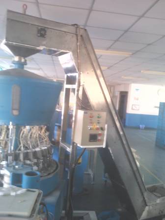 负压裙边提升机用于超细介质的输送,传送带装置安装在封闭的传送带外罩,传送带外罩固定在机架上,在传送带外罩上设有进料口和出料口,供料装置的出口与传送带外罩的进料口密封连接,物料可以从供料装置不间断地输送到收料装置,在传送带外罩内产生负压,使得物料不会外泄;供料装置的出口处设计了控制门,确保送料量和收料量保持相等;传送带由基带和裙边带组成,有效防止超细物料侧漏,减少了浪费,节约了成本。超细介质负压裙边提升机实现了节能降耗和绿色环保生产。