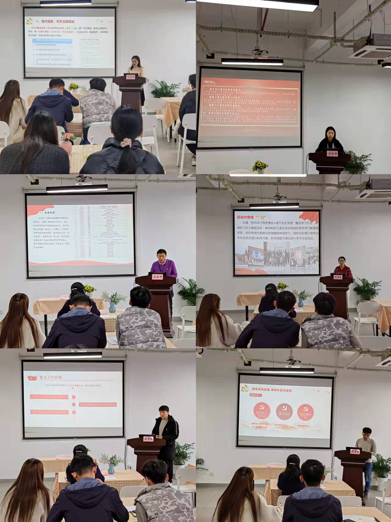 会上,车迷俱乐部党支部书记吕悦、机电专业研究生党支部书记卢姗等6名支部书记,结合支部三会一课、支部特色工作、存在的不足以及下一步改进措施等进行了汇报。
