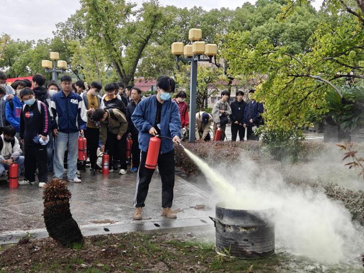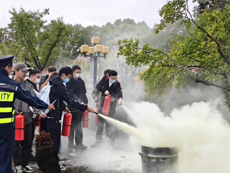 疏散演练结束后,随即开展灭火技能培训。吴挺现场讲授演示了干粉灭火器“提、拔、握、压”的核心操作要领和操作注意事项,并通过现场模拟起火点进行灭火示范,研究生们分组轮流进行灭火实操训练,确保每位参与者都能熟练掌握灭火技巧。