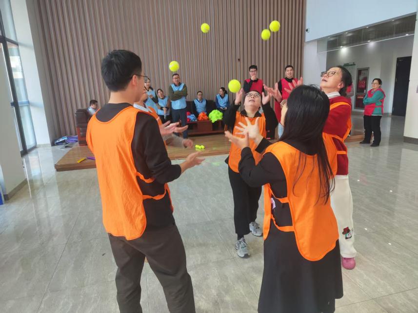 黄中子在活动前为各组成员进行动员打气。本次活动设置“移动高尔夫”、“不倒森林”、“集体长绳”、“合力筑塔”等4个具有挑战以及趣味性的项目,教职工们在教练的引导下,分成四个小队,齐心协力、勇于挑战,共同完成素拓项目。活动现场气氛热烈,呐喊声、加油声在现场回荡。