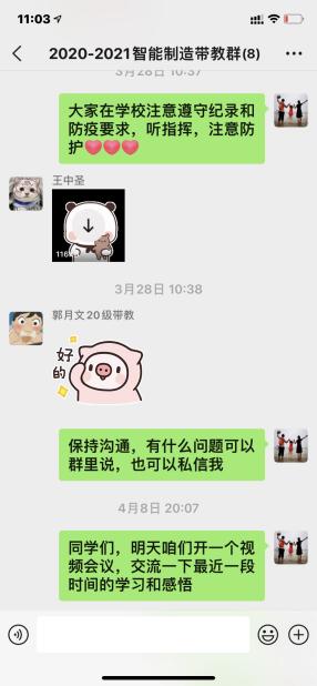 力学团队共有6位带教专任教师,共带教大一到大四约80名本科生,专业为机械制造及自动化(现代装备及控制工程)和机械工程。311日学校封闭管理以来,各年级学生被关在寝室开展网课已经一月有余,不定期进行核酸和抗原检测,为摸排了解学生在校期间的学习和生活情况,团队每位教师以不同的方式(电话、微信、QQ、腾讯会议等)与自己带教学生进行交流,掌握学生的学习和生活动态。