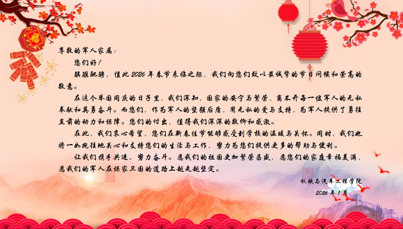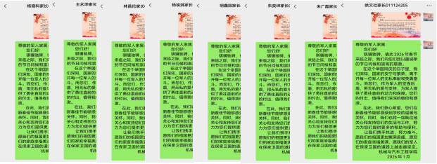 一字一句总关情,一书一信连山海。学院以电话、短信的形式与30余名现役学生密切联系,关心了解他们在部队训练、技能学习、岗位建功等方面的动态,寄语他们在战备执勤、竞技比武中当标杆、打头阵、作表率,把个人成长融入强军实践。同时,与现役学生家属们拉家常、问冷暖、听诉求,详细了解他们的工作、生活情况,并寄送新春礼包和节日贺卡,对军属们坚定支持儿女投身国防事业致以崇高敬意和衷心感谢,并表示学院将一如既往当好坚强后盾,让现役学生安心服役、军属家庭温暖过年。