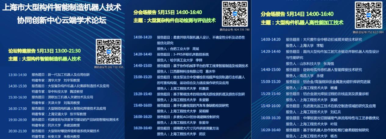 此次云端学术论坛于513-515日为期三天线上召开,6场专家主题报告、16场分会场报告,20多位校内外学者共同探讨大型构件智能制造机器人的发展前沿与挑战机遇,促进航空航天、船舶海工、新能源汽车、轨道车辆等领域大型构件智能制造机器人技术的学术交流与应用创新。