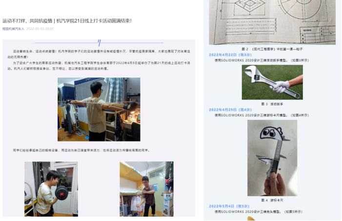 组织广大团员青年开展“共克时艰,暖心应援”活动,创作《“疫”尘不染,同心守“沪”》手势舞视频为全院师生加油鼓劲。开展《“机”极抗疫 不言放“汽”》系列线上抗疫活动:《云上春日,同‘屏’战疫云上春日》、《同‘屏’战疫》、《云上课堂》、《你的优秀,有“记”可循》、《运动不打烊,共同抗疫情》、《春日观影》等线上活动,结合喜迎二十大、庆祝建团百年等主题,累计开展20余场主题活动,让学院广大团员青年相聚云端,将团员学生的专业特长、技术专长转化为服务学校疫情防控工作的强大合力。