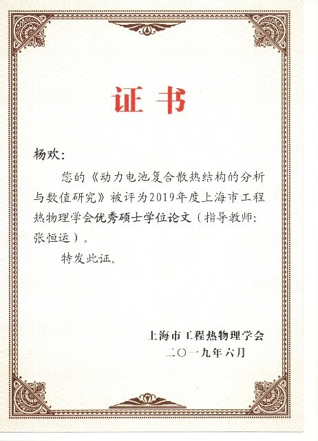 上海市工程热物理学会2019年度学术年会于6月1日在上海理工大学召开,会上颁发了2019年度上海市工程热物理学会优秀博士学位论文奖和优秀硕士学位论文奖,我校英国上市公司365张恒运教授指导硕士毕业生杨欢同学的硕士学位论文《动力电池复合散热结构的分析与数值》, 荣获学会优秀硕士学位论文奖,并受邀在本次大会上做了学术报告。