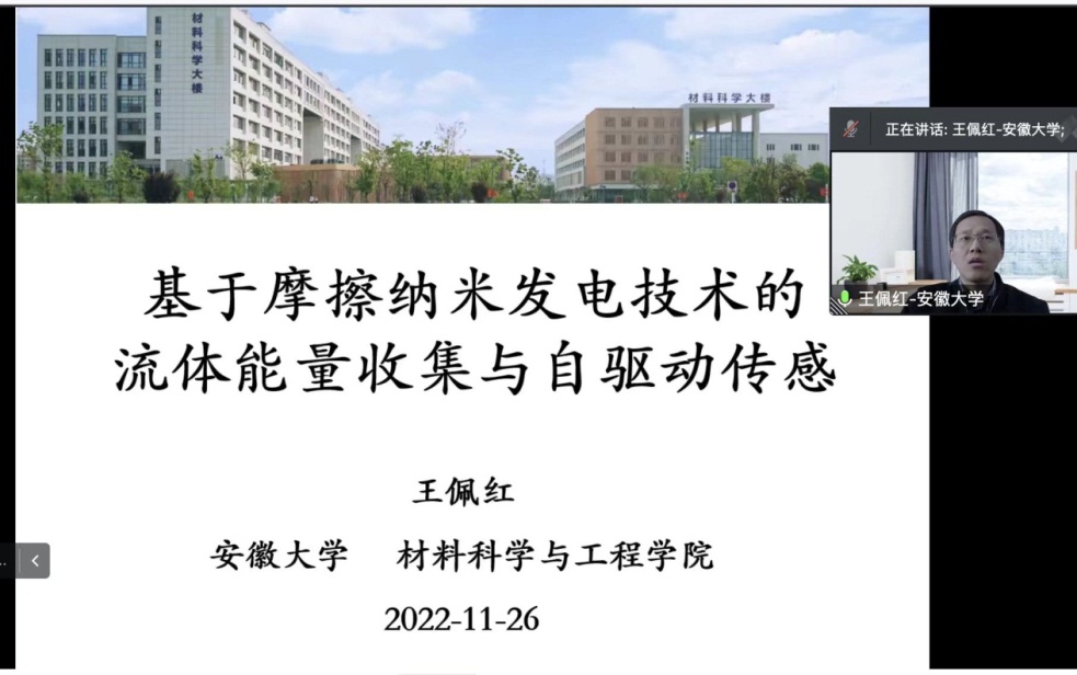 王佩红教授以“基于摩擦纳米发电技术微纳能量收集与自驱动传感”为题,首先介绍王忠林院士,关于摩擦纳米发电机这个概念的产生,以及在国际学术界的影响力。并在基于柔性弹性摩擦发电的旋转发电机和摆动发电机的基础上,提出了一种由摆动转旋转机制和势能储存/释放策略耦合的宽频、输出可控型摩擦纳米发电机(SR-TENG),用以收集环境中不规则、低频率和低强度机械能。这种策略为提高TENG的频带宽度、能量转换效率以及耐久性提供了一种新的可借鉴思路。这种在原有基础设计上进行发散性思维的设计给同学们提供了一种研究思路。