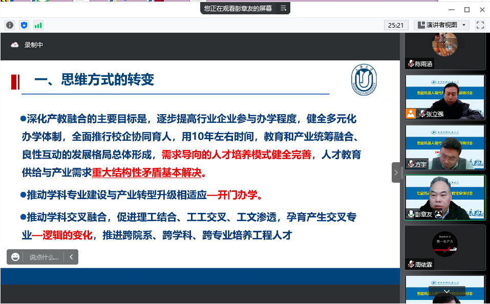 为培养现代产业发展所需的高素质应用型、复合型、创新型人才,推动学院转型特色发展,12月21日,我院举办智能机器人现代产业学院研讨会。会议邀请上海大学教务部常务副部长彭章友教授及我校质量办副处长姚红光老师作报告,英国上市公司365院长方宇教授、副院长张立强、副院长刘新田、机电系主任熊根良、机制系主任张海峰,以及相关系室教师参加会议。会议由方宇院长主持。