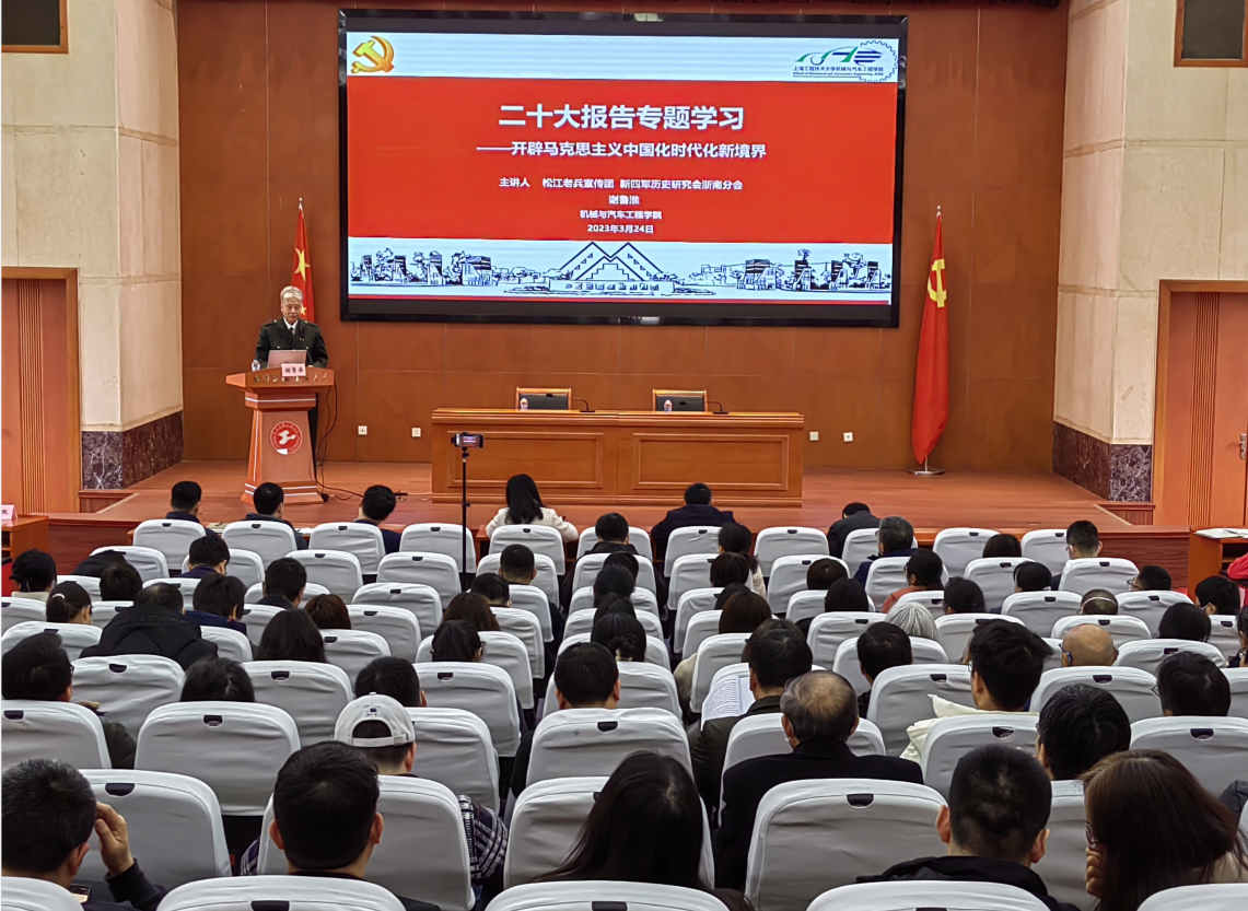 谢鲁淮老兵作了主题为《开辟马克思主义中国化时代化新境界》的专题报告。年逾古稀的谢老同志,依然精神矍铄,满怀激情的报告感染了现场每一位聆听者。谢老同志结合学习党的二十大精神心得体会和个人实际,从老兵视角、用老兵语言,宣讲党的百年奋斗成就,宣讲新时代十年的伟大变革,宣讲新时代的奋斗故事,激励全体教职员工不忘初心、感恩奋进,引导和教育当代大学生立志成为一个有理想、敢担当、能吃苦、肯奋斗的新时代好青年,在推动经济社会发展中展现更大担当和作为。