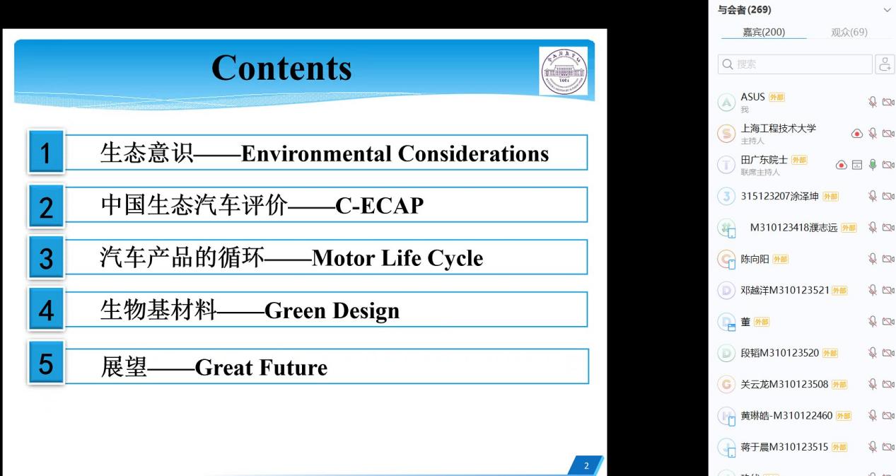 2023年9月2日上午10:00,北京建筑大学教授、博士生导师田广东院士通过华为云会议视频平台,为暑期学校做题为《车辆生态设计现状分析与进展》的线上专题讲座。本次讲座由英国上市公司365副院长刘新田主持。