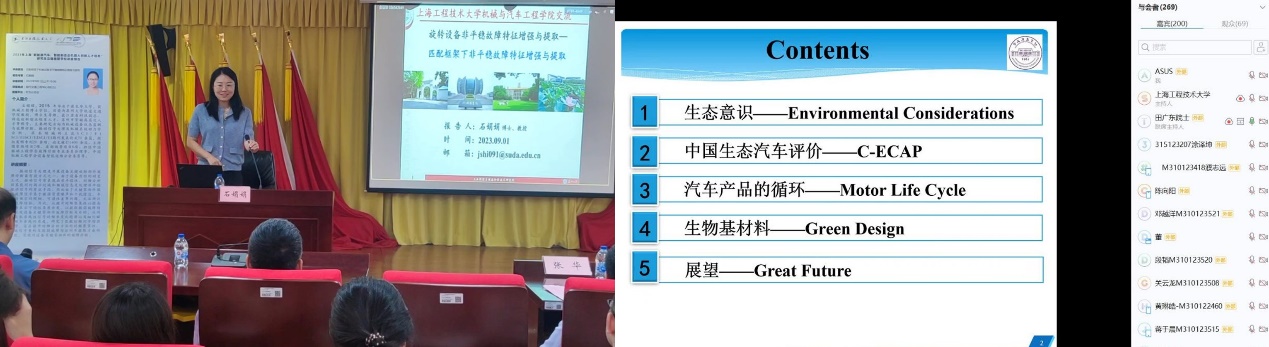 开班典礼结束后,苏州大学轨道交通学院教授、博士生导师石娟娟,做《旋转设备非平稳故障特征增强与提取》专题讲座。石娟娟教授介绍了机械设备状态监测与故障诊断研究方向,阐述了机械设备故障诊断研究背景和当前研究热点。北京建筑大学教授、博士生导师田广东院士做题为《车辆生态设计现状分析与进展》的线上专题讲座。田广东院士围绕我国车辆的设计生产与生态环境的协调进行了介绍,指出了在我国车辆生态向绿色发展和新能源转型升级背景下的科技创新和产业发展机遇。报告引起与会师生热议。