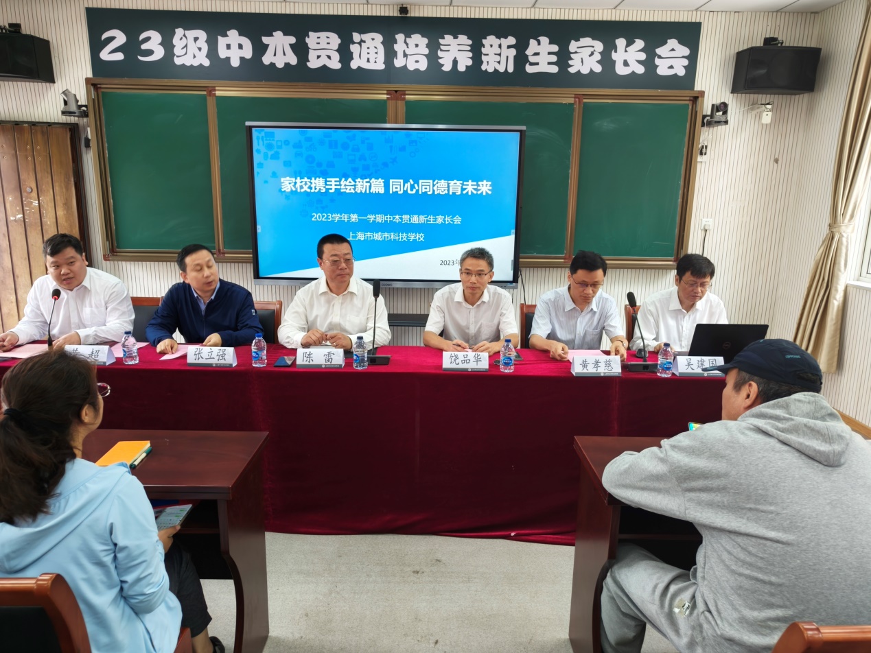 "Seek the elders of the wood, and they will consolidate their roots. "In order to better implement the fundamental task of cultivating morality, we will effectively transform the results of theme education, learning, research, and inspection and rectification into practical actions for educating people. On the morning of September 23, 2023, the School of Mechanical and Automotive Engineering of Shanghai University of Engineering Science and Shanghai City Science and Technology School held a parents' meeting for the 2023 class of freshmen. Rao Pinhua, Director of the Academic Affairs Office of Shanghai University of Engineering Science, Chen Lei, President of Shanghai City Science and Technology School, Zhang Liqiang, Deputy Dean of the School of Mechanical and Automotive Engineering of Shanghai University of Engineering Science, Huang Xiaoci, Director of the Department of Automotive Service Engineering, Wu Jianguo, Director of the Comprehensive Education Department of Shanghai City Science and Technology School, and all parents of the Zhongben Through-the-Road Training Class attended the meeting. The meeting was chaired by Huang Chao, vice president of Shanghai City Science and Technology School.