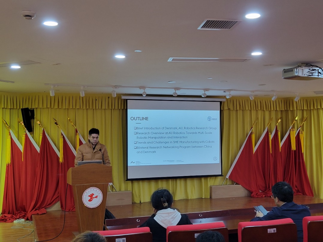 张教授在报告中详细介绍了其所在课题组进行的最新研究成果。报告涵盖了多个领域,包括机器人系统的设计建模和控制、机器人操纵控制理论、康复机器人和工业机器人的制造与生产。特别是在协作机器人领域,张教授探讨了中小企业生产和制造中的挑战,并提出了一些解决方案。他指出,协作机器人在提高生产效率、降低成本和改善工作环境方面具有巨大潜力。张教授表示,通过深入研究和合作,中丹两国可以共同推动协作机器人技术的发展,为双方企业提供更多的合作机会。报告中另一个重要议题是中丹双边研究网络计划。张教授介绍了该计划旨在促进中丹两国科研机构之间的合作,特别是在机器人领域。他强调了这一倡议为两国研究人员提供了一个独特的合作平台,有望推动机器人技术的创新和发展。 随后,张教授耐心解答了同学们提出的问题,并与大家展开了深入的交流和讨论。整个报告会深深吸引了在场师生的兴趣,拓宽了大家的学术视野。张教授与现场师生进行了深入而富有成效的讨论。与会者纷纷表示,张教授团队的研究成果为未来机器人技术的发展描绘了崭新的蓝图,期盼未来能有更多的交流与深入合作。